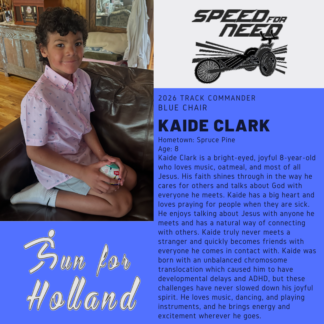 Kaide Clark is a bright-eyed, joyful 8-year-old who loves music, oatmeal, and most of all Jesus. His faith shines through in the way he cares for others and talks about God with everyone he meets. Kaide has a big heart and loves praying for people when they are sick. He enjoys talking about Jesus with anyone he meets and has a natural way of connecting with others. Kaide truly never meets a stranger and quickly becomes friends with everyone he comes in contact with. Kaide was born with an unbalanced chromosome translocation which caused him to have developmental delays and ADHD, but these challenges have never slowed down his joyful spirit. He loves music, dancing, and playing instruments, and he brings energy and excitement wherever he goes.